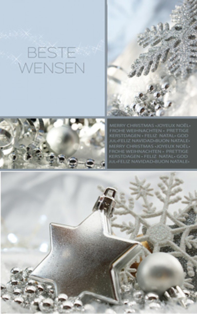 Prachtige ijsblauwe kerstkaart met kerstwens in vele talen